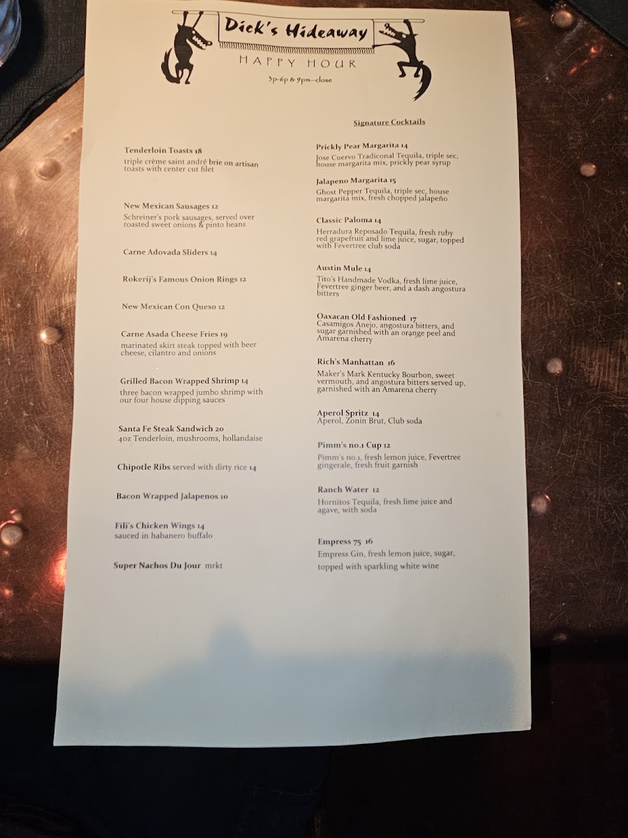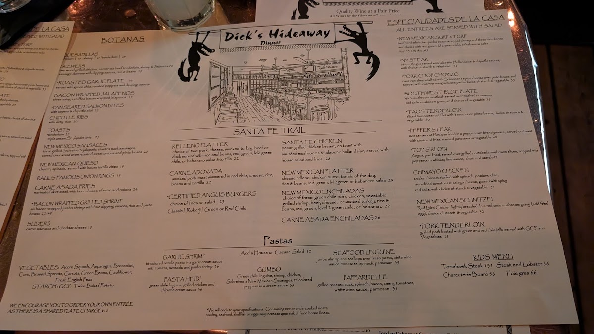 Dick's Hideaway specializes in hearty Southwestern cuisine that celebrates bold flavors and generous portions. Their lunch offerings are a crowd favorite, featuring mouthwatering items such as the Chimayo Chicken—a delicious stuffed chicken breast that bursts with spinach, sundried tomatoes, and spicy poblano chiles, all glazed with a kick of sriracha red chile. For meat lovers, the Carne Adovada —smoked pork roast simmered in rich red chile—practically melts in your mouth. Don’t forget to add a side of the legendary Bacon Wrapped Jalapeños that diners rave about; these savory bites are packed with asiago cheese and wrapped in crispy bacon, making for the perfect start to your meal.